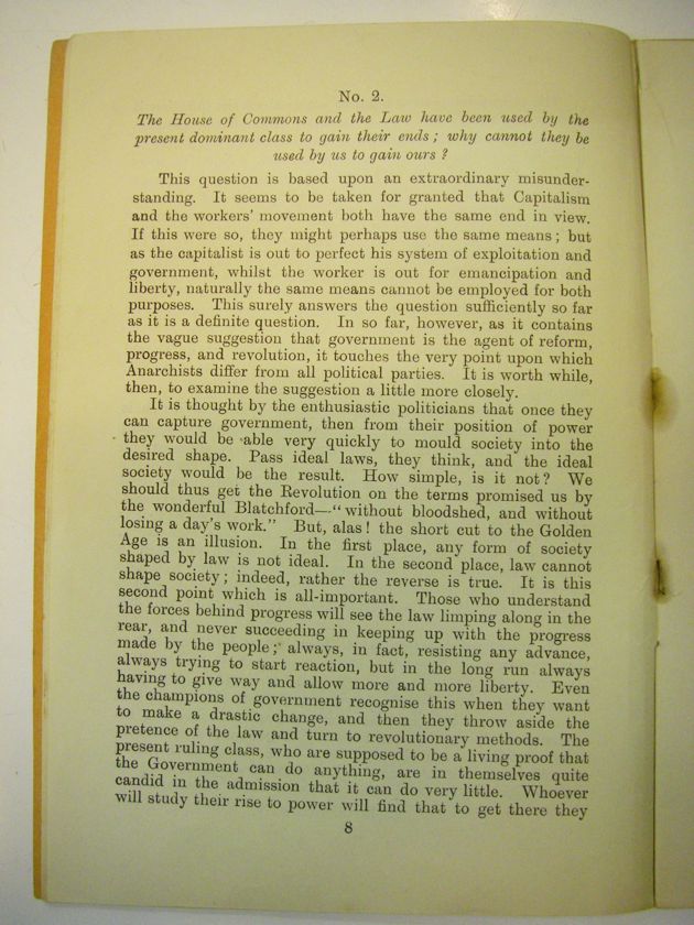 This question is based upon an extraordinary misunderstanding. It seems to be taken for granted that Capitahsm and the workers' movement both have the same end in view. If this were so, they might perhaps use the same means; but as the capitalist is out to perfect his system of exploitation and government, whilst the worker is out for emancipation and liberty, naturally the same means cannot be employed for both purposes. This surely answers the question sufficiently so far as it is a definite question. In so far, however, as it contains the vague suggestion that government is the agent of reform, progress, and revolution, it touches the very point upon which Anarchists differ from all political parties. It is worth while, then, to examine the suggestion a little more closely.
