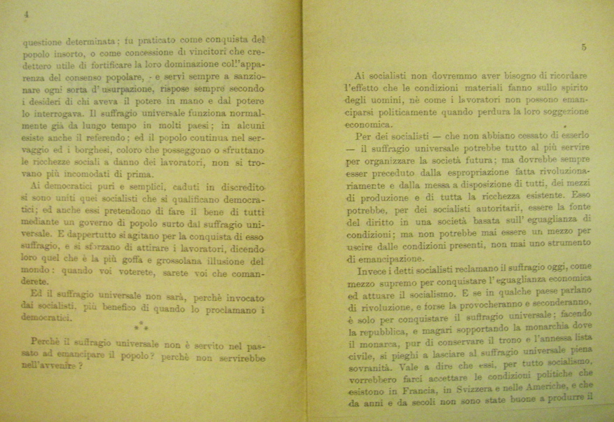 Invece i detti socialisti reclamano il suffragio oggi, come mezzo supreme per conquistare l'eguagliana economica ed attuare il socialismo. E se in qualche paese parlano di rivoluzione, e forse la provocheranno e seconderanno, è solo per conquistare il suffragio universale; facendo la repubblica, e magari supported la monarchia dove il monarca, pur di conservare il trono e l'annesssa lista civile, si pieghi a lasciare al suffragio universale piena sovranità. Vale a dire che essi, per tutto socialismo, vorrebbro farci accettare le condizioni politiche che esistono in Francia, in Seizer e nell Americhe, e che da anni e da secoli non sono state buone a produrre il