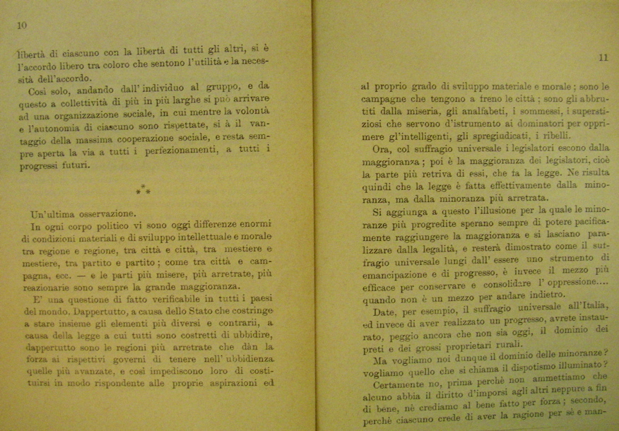 Cosi solo, andando dall'individuo al gruppo, e da questo a collettività di più in più larghe si può arrivare ad una organizzazione sociale, in cui mentre la volontà e l'autonomia di ciascuno sono impetrate, si à il vantaggio della massiam cooperation sociale, e resta sempre aperta la via a tutti i perfezionamenti, a tutti i progressi futuri.