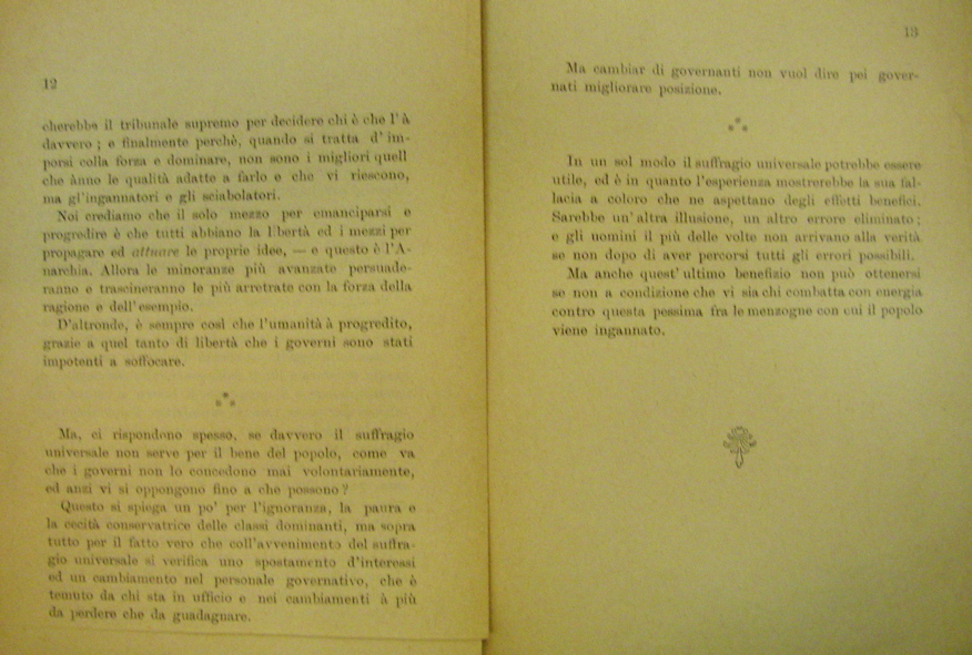 Noi crediamo che il solo mezzo per emancipist e progedire è questo è che tutti abbiano la libertà ed i mezzi per propagare ed attuare le proprie idee, - e l'Anarchia. Allora le minoranze più avanzate persuaderanno e trascineranno le più arretrate con la forza della ragione e dell'esempio.