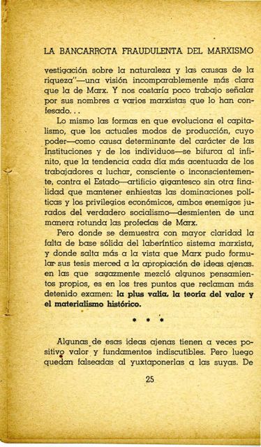 Pero donde se demuestra con mayor claridad la falta de base sólida del laberíntico sistema marxista, y donde salta más a la vista que Marx pudo formular sus tesis merced a la apropiación de ideas ajenas en las que sagazmente mezcló algunos pensamientos propios, es en los tres puntos que reclaman más detenido examen: la plus valía, la teoría del valor y el materialismo histórico.
