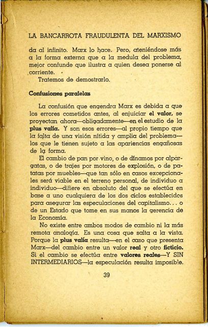 El cambio de pan por vino, o de dinamos por alpargatas, o de trajes por motores de explosión, o de patatas por muebles- que tan solo en casos excepcionales será viable en el terreno personal, de individuo a individuo- difiere en absoluto del que se efectúa en base a uno cualquiera de los dos ciclos establecidos para asegurar las especulaciones del capitalismo... o de un Estado que tome en sus manos la gerencia de la Economía.