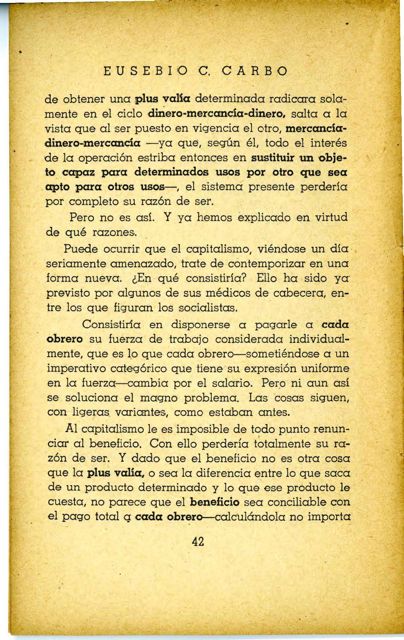 Al capitalismo le es imposible de todo punto renunciar al beneficio. Con ello perdería totalmente su razón de ser. Y dado que el beneficio no es otra cosa que la plus valía, o sea la diferencia entre lo que saca de un producto determinado y lo que ese producto le cuesta, no parece que el beneficio sea conciliable con el pago total a cada obrero -- calculándola no importa