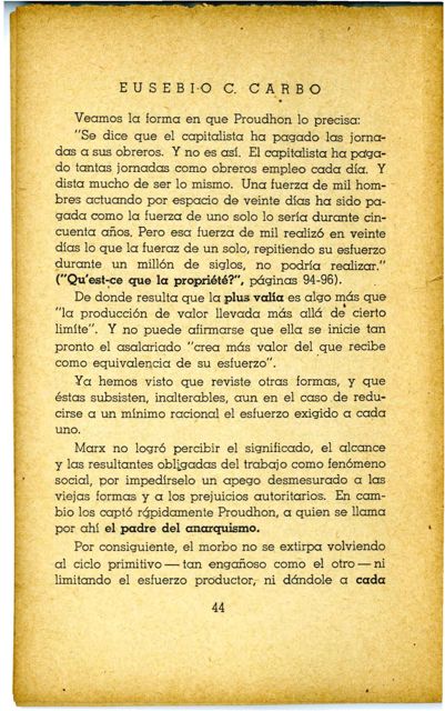 "Se dice que el capitalista ha pagado los jornadas a sus obreros. Y no es así. El capitalista ha pagado tantas jornadas como obreros empleo cada día. Y dista mucho de ser lo mismo. Una fuerza de mil hombres actuando por espacio de veinte días ha sido pagada como obreros empleo cada día. Y dista mucho de ser lo mismo. Una fuerza de mil hombres actuando por espacio de veinte días ha sido pagada como la fuerza de uno solo lo seria durante cincuenta años. Pero esa fuerza de mil realizo en veinte días lo que la fueraz de un solo, repitiendo so esfuerzo durante un millón de siglos, no podría realizar." ("Qu'est-ce que la propriete?" paginas 94-96).