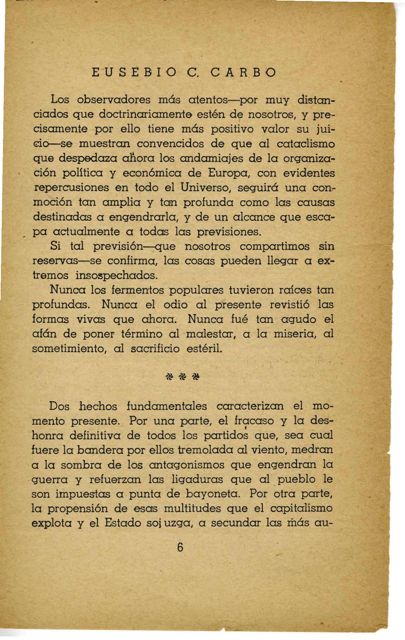 Dos hechos fundamentales caracterizan el momento presente. Por una parte, el fracaso y la deshonra definitiva de todos los partidos que, sea cual fuere la bandera por ellos tremolada al viento, medran a la sombra de los antagonismos que engendran la guerra y refuerzan las ligaduras que al pueblo le son impuestas a punta de bayoneta. Por otra parte, la propensión de esas multitudes que el capitalismo explota y el Estado sojuzga, a secundar la más au-