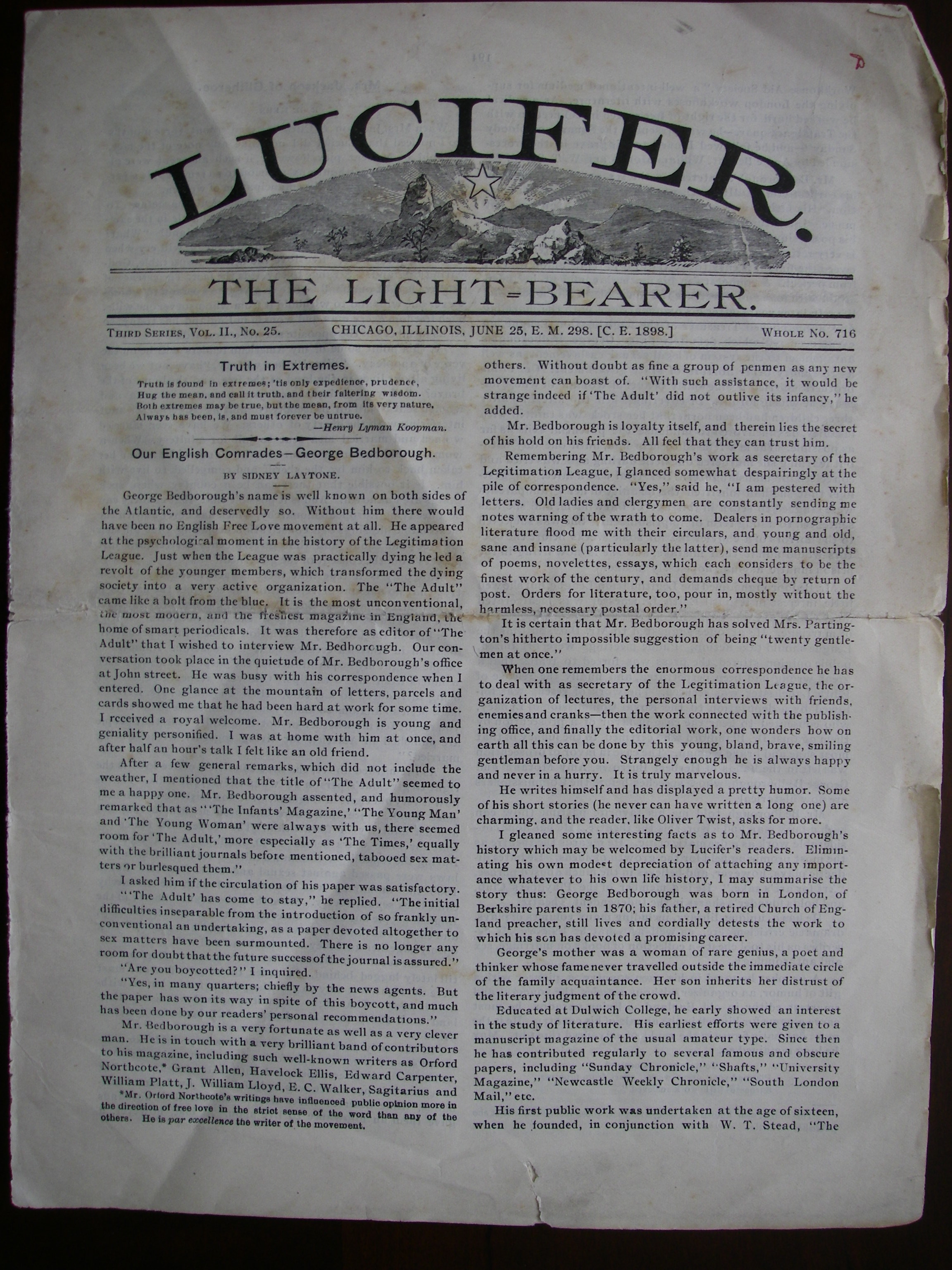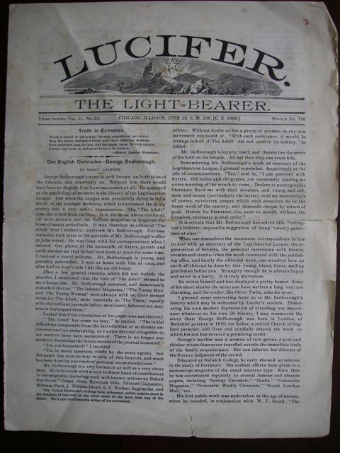 I gleaned some interesting facts as to Mr. Bedborough's history which may be welcomed by Lucifer's readers. Eliminating his own model depreciation of attaching any importance whatever to his own life history, I may summarise the story thus: George Bedborough was born in London, of Berkshire parents in 1870; his father, a retired Church of England preacher, still lives and cordially detests the work to which his Son has devoted a promising career. George's mother was a woman of rare genius, a poet and thinker whose fame never travelled outside the immediate circle of the family acquaintance. Her son inherits her distrust of the literary judgment of the crowd.