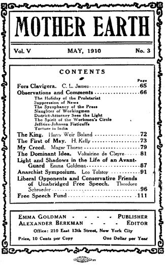 The issues and arguments thus presented by the suppression of Miss Goldman, and of sex-discussion, should be fairly and frankly answered, or supported by our liberal friends. It seems to me that this has not been done, and I am going to call attention to this record for the purpose of exhibiting what seem to me to be the evasions and mistakes my liberal friends have made, in the hope that some may be dissuaded from the repetition of their folly, which may have been induced by an excessive zeal for retaining a speaking acquaintance with respectability.