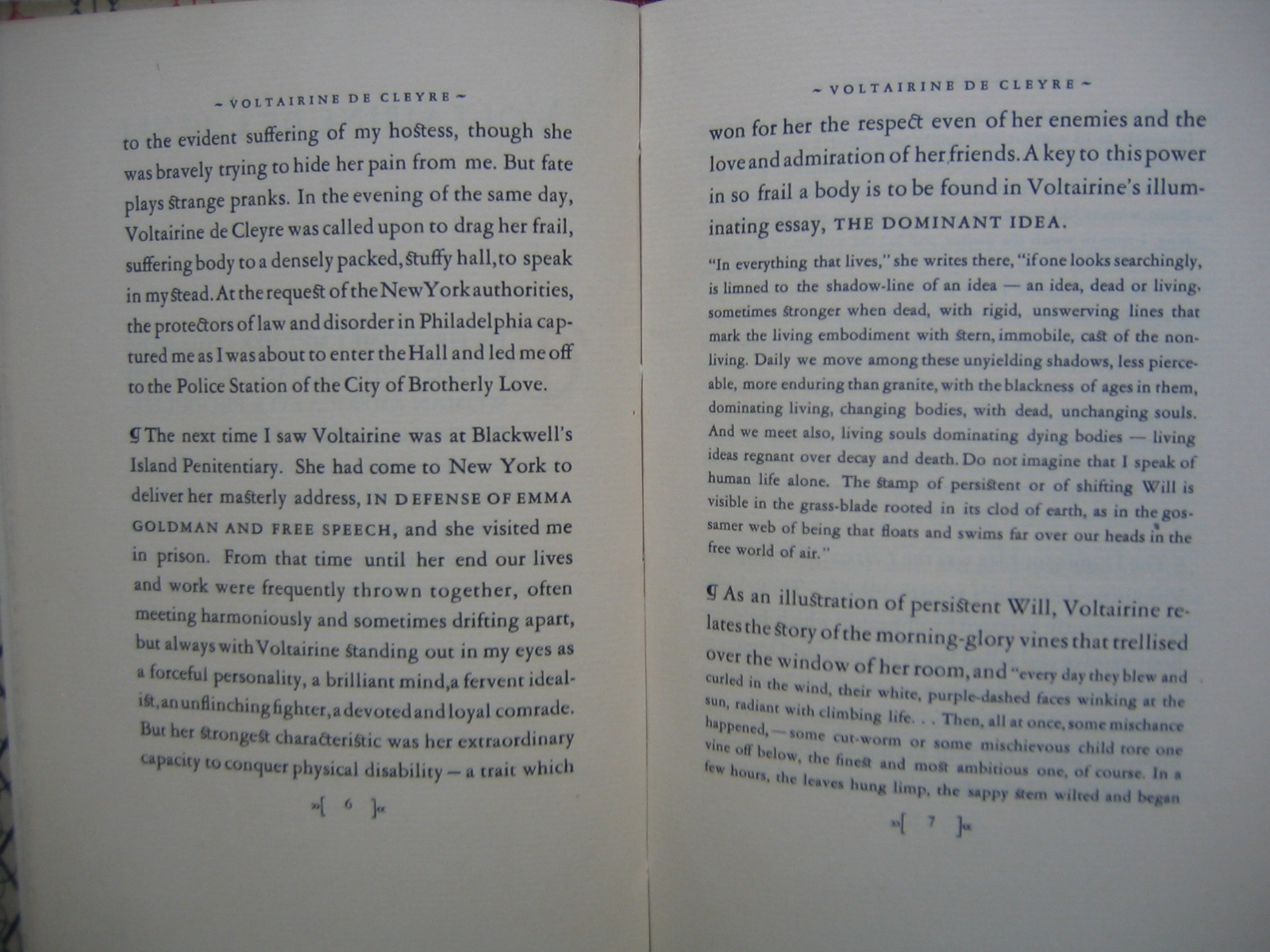 The next time I saw Voltairine was at Blackwell's Island Penitentiary. She had come to New York to deliver her masterly address, IN DEFENSE OF EMMA GOLDMAN AND FREE SPEECH, and she visited me in prison. From that time until her end our lives and work were frequently thrown together, often meeting harmoniously and sometimes drifting apart, but always with Voltairine standing out in my eyes as a forceful personality, a brilliant mind, a fervent idealist, an unflinching fighter, a devoted and loyal comrade. But her strongest characteristic was her extraordinary capacity to conquer physical disability --- a trait which