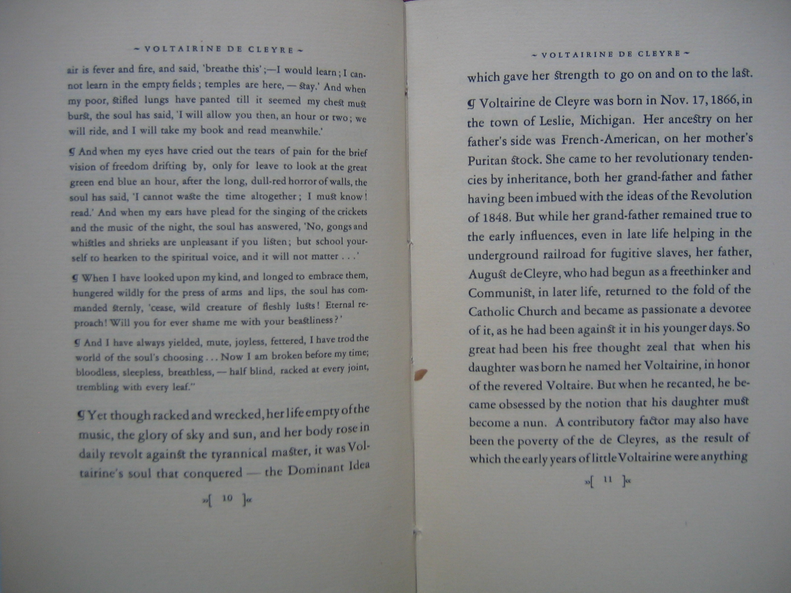 Voltairine de Cleyre was born in Nov. 17, 1866, in the town of Leslie, Michigan. Her ancestry on her father's side was French-American, on her mother's Puritan stock. She came to her revolutionary tendencies by inheritance, both her grand-father and father having been imbued with the ideas of the Revolution of 1848. But while her grand-father remained true to the early influences, even in the late life helping in the underground railroad for fugitive slaves, her father, August de Cleyre, who had begun as a freethinker and Communist, in later life returned to the fold of the Catholic Church and became as passionate a devotee of it, as he had been against it in his younger days. So great had been his free thought zeal that when his daughter was born he named her Voltairine. But when he recanted, he became obsessed by the notion that his daughter must become a nun. A contributory factor may also have been the poverty of the de Cleyres, as the result of which the early years of little Voltairine were anything