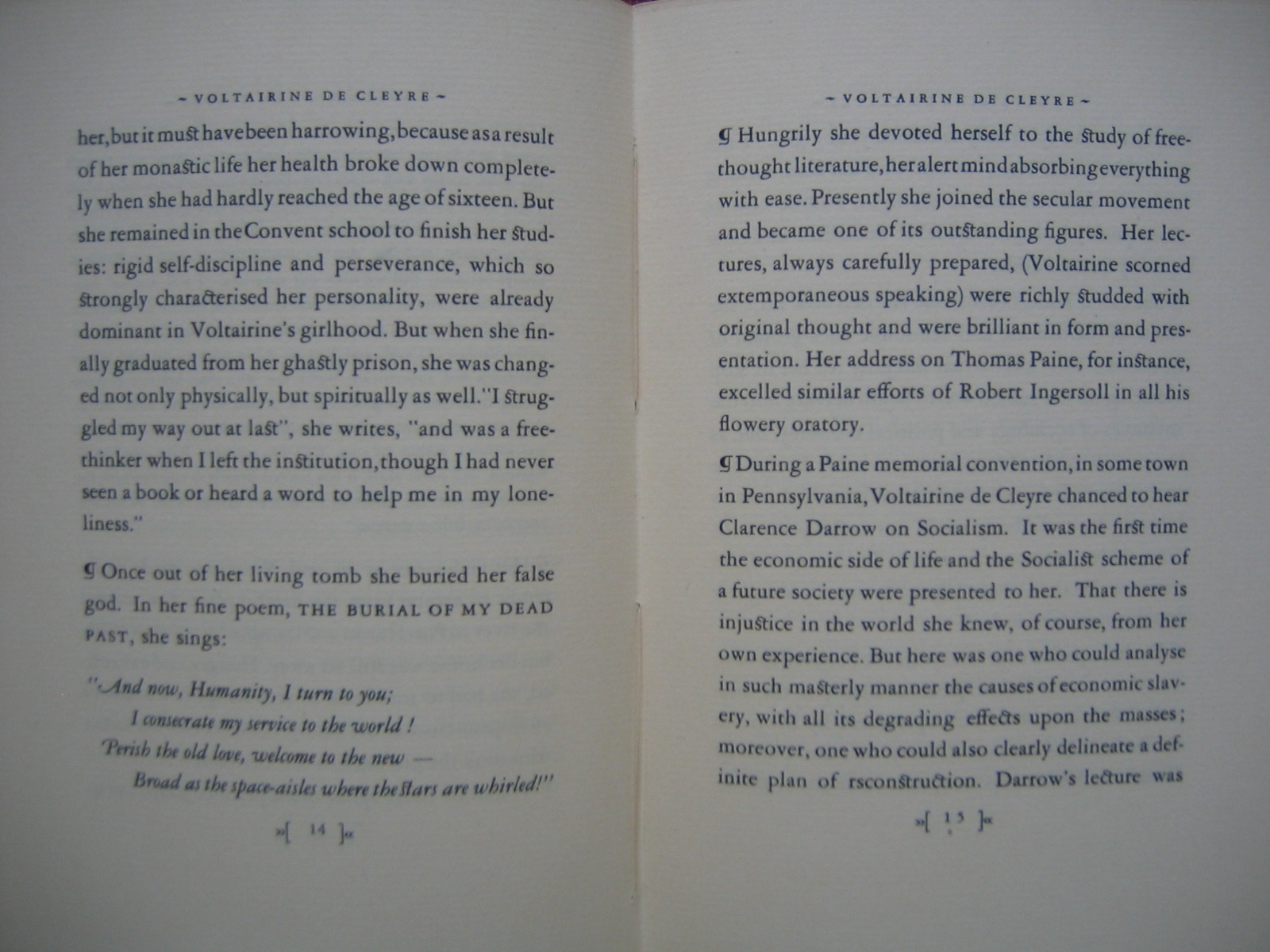 During a Paine memorial convention, in some town in Pennsylvania, Voltairine de Cleyre chanced to hear Clarence Dorrow on Socialism. It was the first time the economic side of life and the socialist scheme of future society were presented to her. That there is injustice in the world she knew, of course, from her own experience. But here was one who could analyze in such masterly manner the causes of economic slavery, with all its degrading effects upon the masses: more over, one who could also clearly delineate a definite plan of reconstruction. Darrow's lecture was