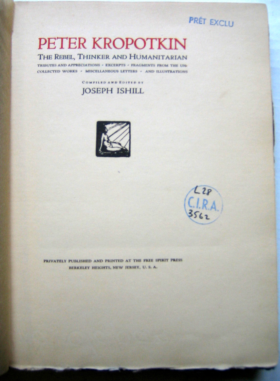 Ishill, Joseph, editor (1924). Peter Kropotkin: the Rebel, Thinker and Humanitarian. Berkeley Heights, N.J.: Free Spirit Press.