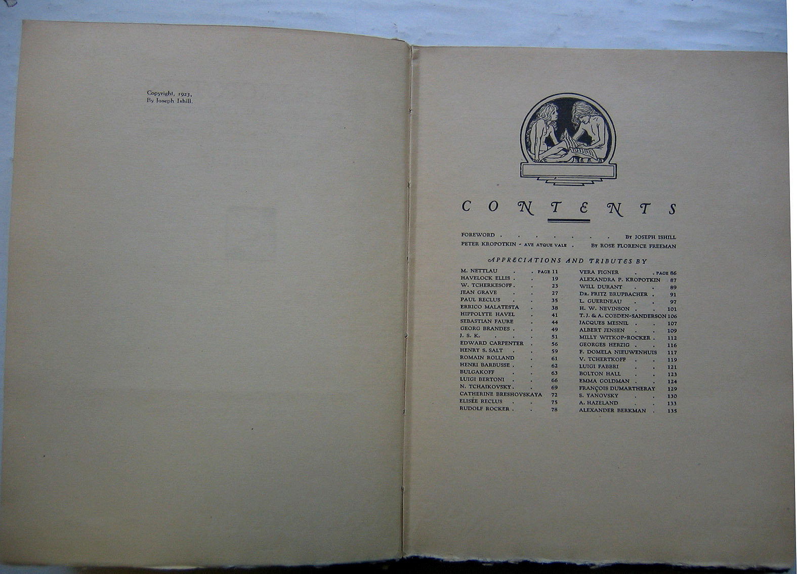 Ishill, Joseph, editor (1924). Peter Kropotkin: the Rebel, Thinker and Humanitarian. Berkeley Heights, N.J.: Free Spirit Press.