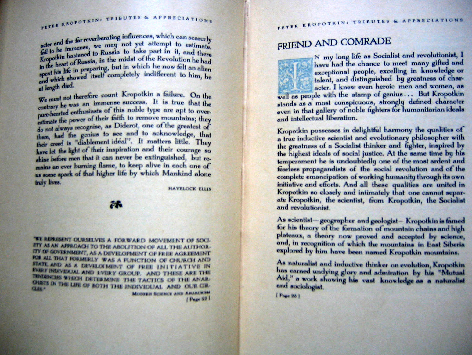 Kropotkin possesses in delightful harmony the qualities of a true inductive scientist and evolutionary philosopher with the greatness of a Socialist thinker and fighter, inspired by the highest ideals of social justice. At the same time by his temperament he is undoubtedly one of the most ardent and fearless propagandists of the social revolution and of the complete emancipation of working humanity through its own initiative and efforts. And all these qualities are united in Kropotkin so closely and intimately that one cannot separate Kropotkin, the scientist, from Kropotkin, the Socialist and revolutionist.