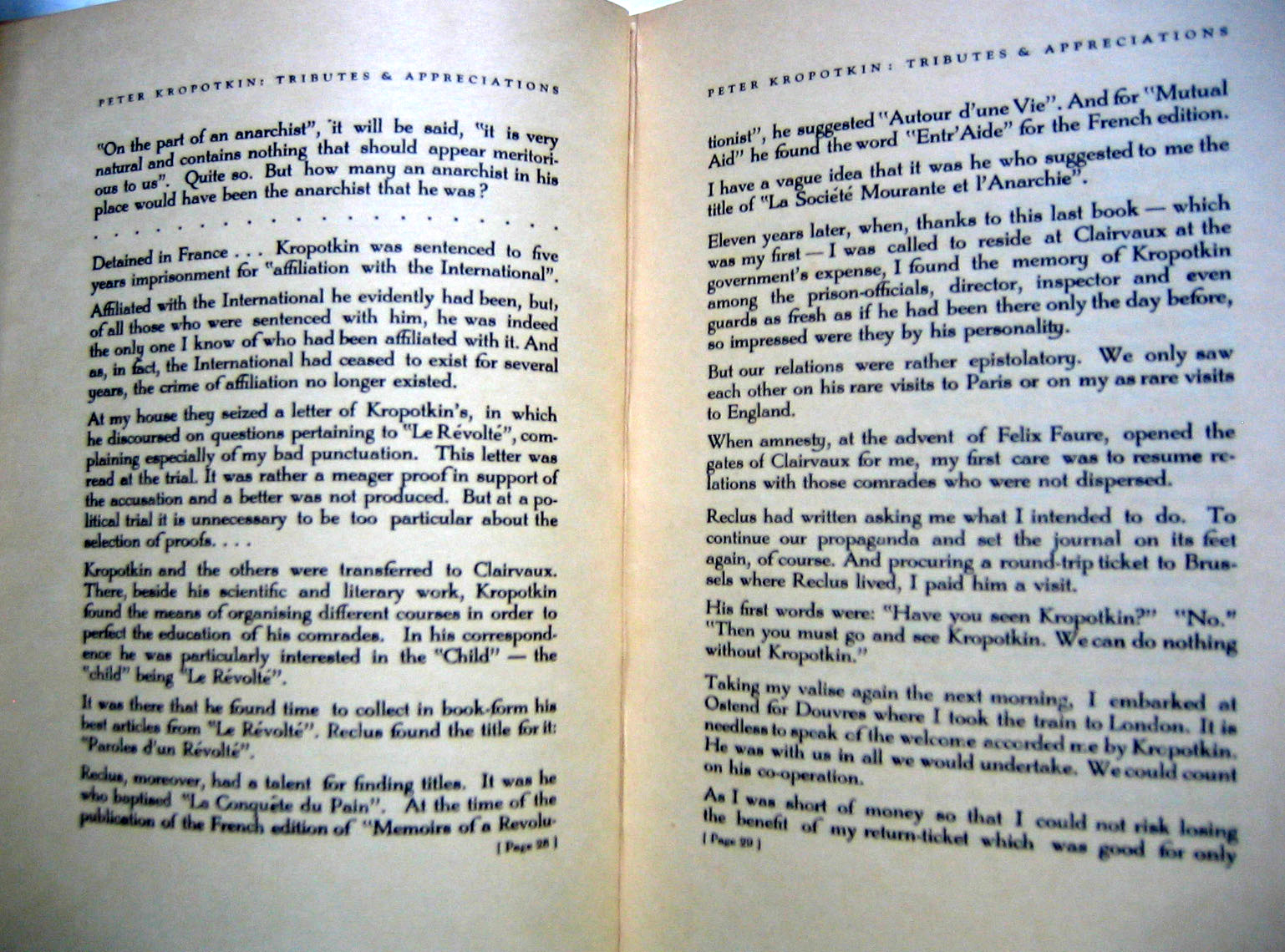 Reclus, moreover, had a talent for finding titles. It was he who baptised "La Conquéte du Pain". At the time of the publication of the French edition of "Memoirs of a Revolutionist", he suggested "Autour d'une Vie". And for "Mutual Aid" he found the word "Entr'Aide" for the French edition.