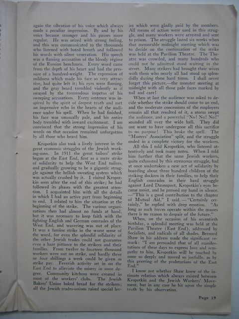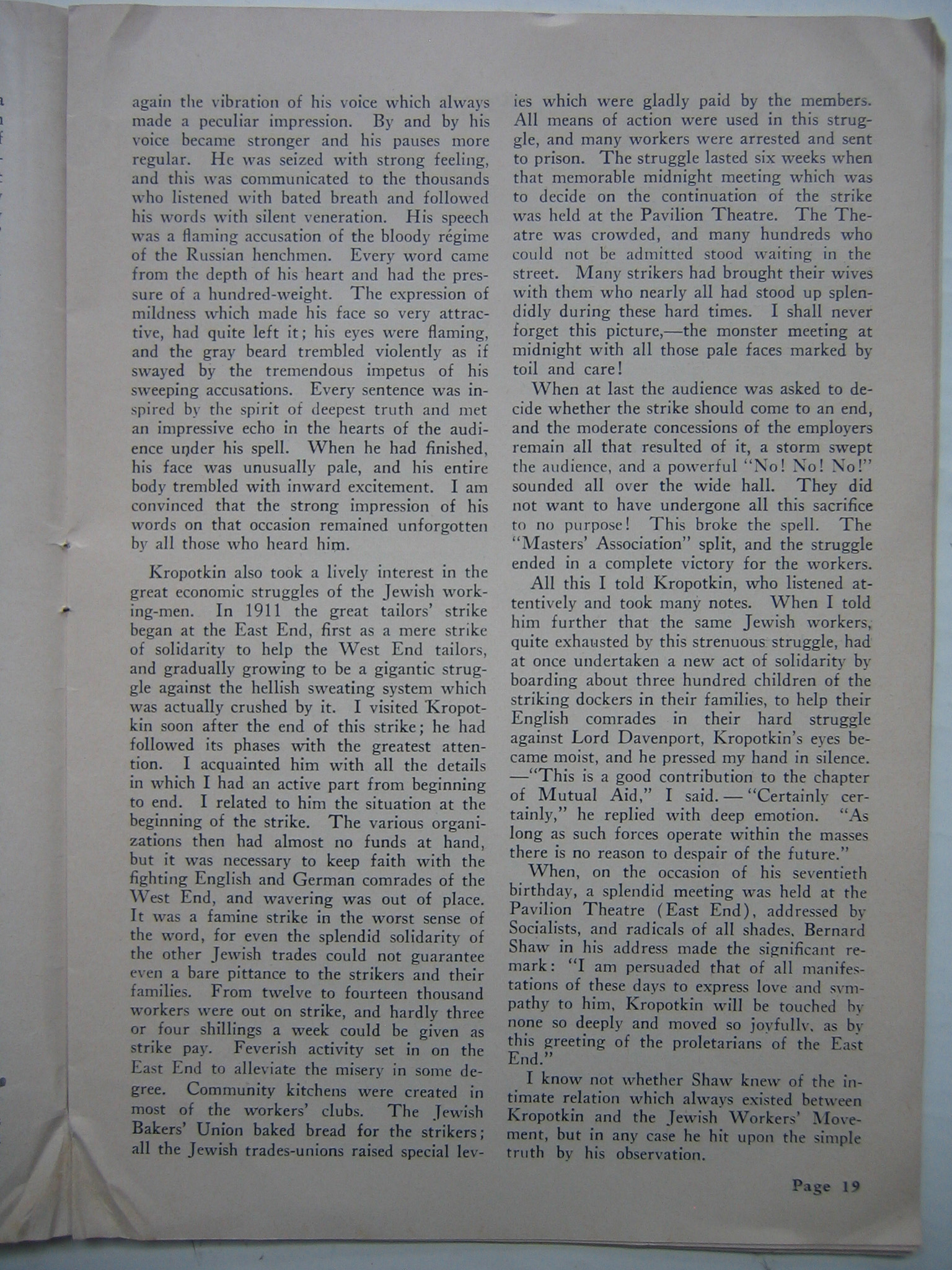 All this I told Kropotkin, who listened attentively and took many notes. When I told him further that the same Jewish workers, quite exhausted by this strenuous struggle, had at once undertaken a new act of solidarity by boarding about three hundred children of the striking dockers in their families, to help their English comrades in their hard struggle against Lord Davenport, Kropotkin's eyes became moist, and he pressed my hand in silence. —"This is a good contribution to the chapter of Mutual Aid," I said. — "Certainly certainly," he replied with deep emotion. "As long as such forces operate within the masses there is no reason to despair of the future." When, on the occasion of his seventieth birthday, a splendid meeting was held at the Pavilion Theatre (East End), addressed by Socialists, and radicals of all shades. Bernard Shaw in his address made the significant remark : "I am persuaded that of all manifestations of these days to express love and sympathy to him, Kropotkin will be touched by none so deeply and moved so joyfully, as by this greeting of the proletarians of the Fast End." I know not whether Shaw knew of the in-timate relation which always existed between Kropotkin and the Jewish Workers' Movement, but in any case he hit upon the simple truth by his observation.