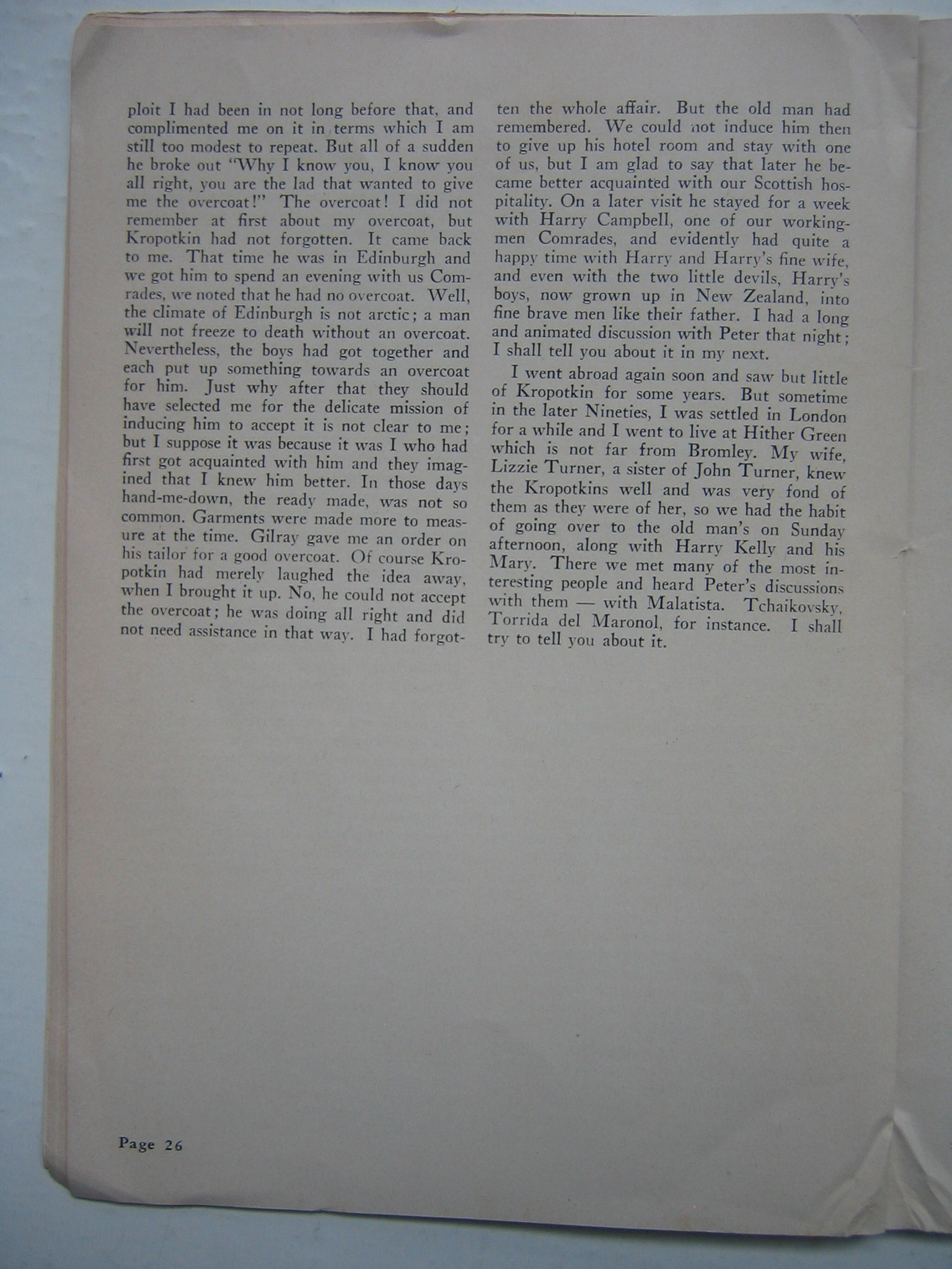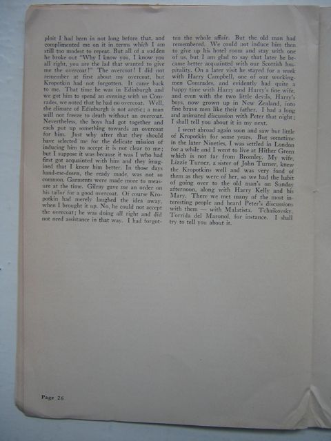 ploit I had been in not long before that, and complimented me on it in terms which I am still too modest to repeat. But all of a sudden he broke out "Why I know you, I know you all right, you are the lad that wanted to give me the overcoat!" The overcoat! I did not remember at first about my overcoat, but Kropotkin had not forgotten. It came back to me. That time he was in Edinburgh and we got him to spend an evening with us Comrades, we noted that he had no overcoat. Well, the climate of Edinburgh is not arctic; a man will not freeze to death without an overcoat. Nevertheless, the boys had got together and each put up something towards an overcoat for him. Just why after that they should have selected me for the delicate mission of inducing him to accept it is not clear to me; but I suppose it was because it was I who had first got acquainted with him and they imagined that I knew him better. In those days hand-me-down, the ready made, was not so common. Garments were made more to measure at the time. Gilray gave me an order on his tailor for a good overcoat. Of course Kropotkin had merely laughed the idea away, when I brought it up. No, he could not accept the overcoat; he was doing all right and did not need assistance in that way. I had forgotten the whole affair. But the old man had remembered. We could not induce him then to give up his hotel room and stay with one of us, but I am glad to say that later he became better acquainted with our Scottish hospitality. On a later visit he stayed for a week with Harry Campbell, one of our working-men Comrades, and evidently had quite a happy time with Harry and Harry's fine wife, and even with the two little devils, Harry's boys, now grown up in New Zealand, into fine brave men like their father. I had a long and animated discussion with Peter that night; I shall tell you about it in my next.