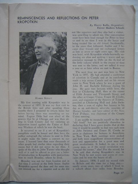 Bromley was not far from London and in due time I arrived at the little house. Sophie Kropotkin opened the door and for some reason mistook me for a reporter and as she did not like reporters and they also had a visitor, was unwilling to admit me. Our conversation must have been loud enough for Peter to hear us and in no time I was in the house and being treated like an old friend. Incidentally, in the years that followed, Sophie and I became dear friends and we exchanged letters as late as seven or eight years ago. My visit was brief, with Kropotkin whole-heartedly endorsing my plan and writing a warm and appreciative message to Debs on the fly-leaf of the little volume which in the course of time was sent to the latter, and we talked it over a year or so later when we met in Boston.