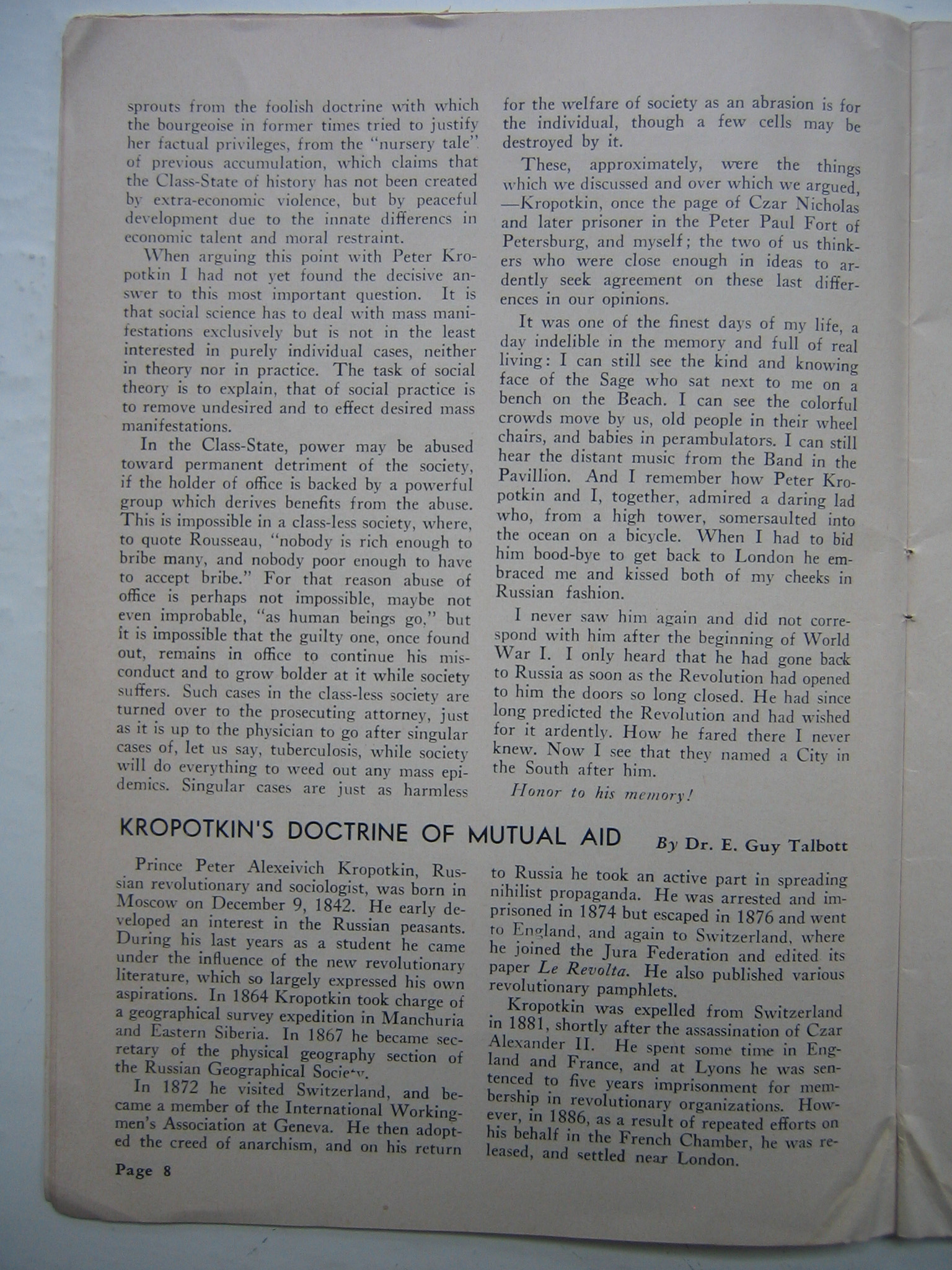 It was one of the finest days of my life, a day indelible in the memory and full of real living: I can still see the kind and knowing face of the Sage who sat next to me on a bench on the Beach. I can see the colorful crowds move by us, old people in their wheel chairs, and babies in perambulators. I can still hear the distant music from the Band in the Pavillion [sic]. And I remember how Peter Kropotkin and I, together, admired a daring lad who, from a high tower, somersaulted into the ocean on a bicycle. 'When I had to bid him hood-bye to get back to London he embraced me and kissed both of my cheeks in Russian fashion.