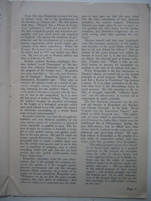 The best American interpreter for the mutual aid theories of Kropotkin and Novikov was George Nasmyth. In his book, "Social Progress and the Darwinian Theory," pub-lished in 1916, Nasmyth says: "The philosophy of force, which is anti-Democratic, and anti-Christian, has fallen like a blight upon the intellectual life of Christendom during the past half-century, but its effects have been almost entirely confined to the aristocratic, in-tellectual, and governing classes." He pays high tribute to Kropotkin as the prophet of a new order of cooperative society, and concludes with this quotation from Kropotkin: