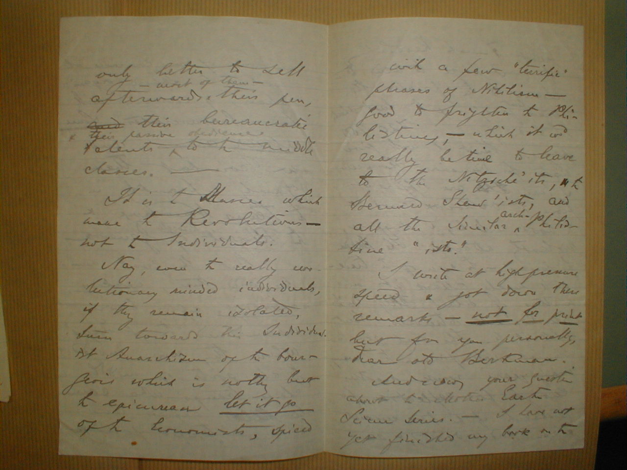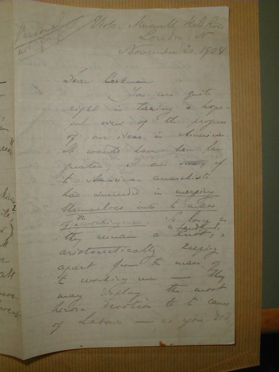Dear, good friend --- their efforts will remain fruitless and their teachings will appeal more to the intellectual bourgeois who rebels against certain restraints in Art, in relations between man and woman, than to the worker. They will remain the same bourgeois and will do nihil to remove the the oppresion of the rich upon the poor, of the owner on the proletarian, the Ruler upon the Ruled one.