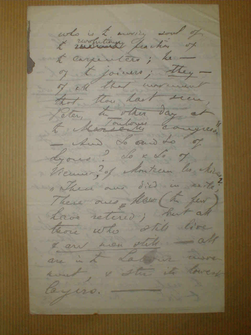 who is the moving soul of the revolutionary fraction of the carpenters; he --- of the joiners; they --- of all that movement, that thou hast seen, Peter, the other day at the Toulouse congress," And so and so of Lyons? So and So of Vienne? of Montceau-les-Mines? "These ones died in exile, These ones (the few) have retired; but all those who still live are men still --- all are in the labour movement and stir its lowest layers. ---