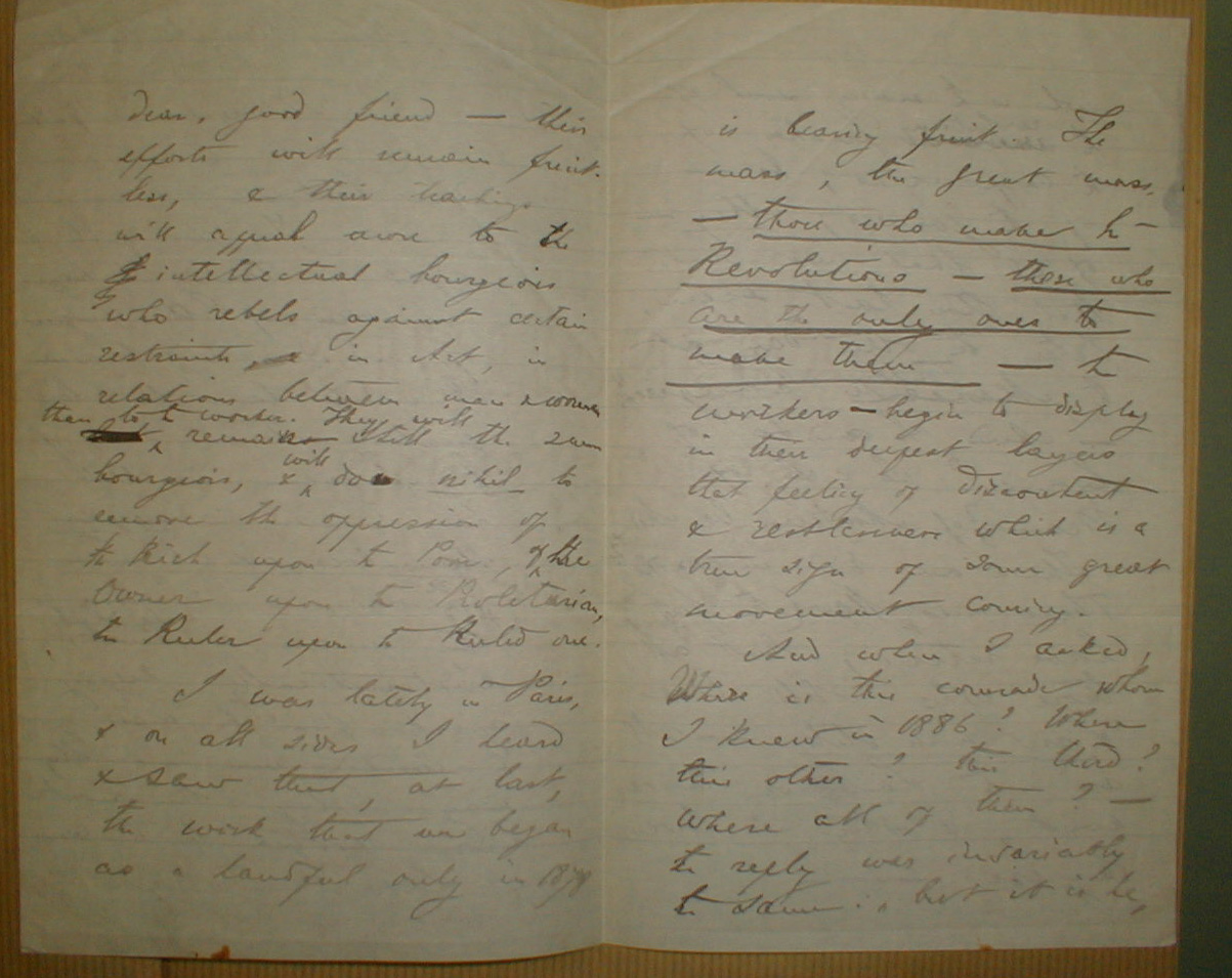 I was lately in Paris, and on all sides I heard and saw that, at last, the work that we began only as a handful only in 1878 is bearing fruit. The mass, the great mass -- those who made the revolution -- those who are the only ones to make them --- the workers --- begin to display in their deepest layers that feeling of discontent and restlessnes which is a true sign of some great movement coming.