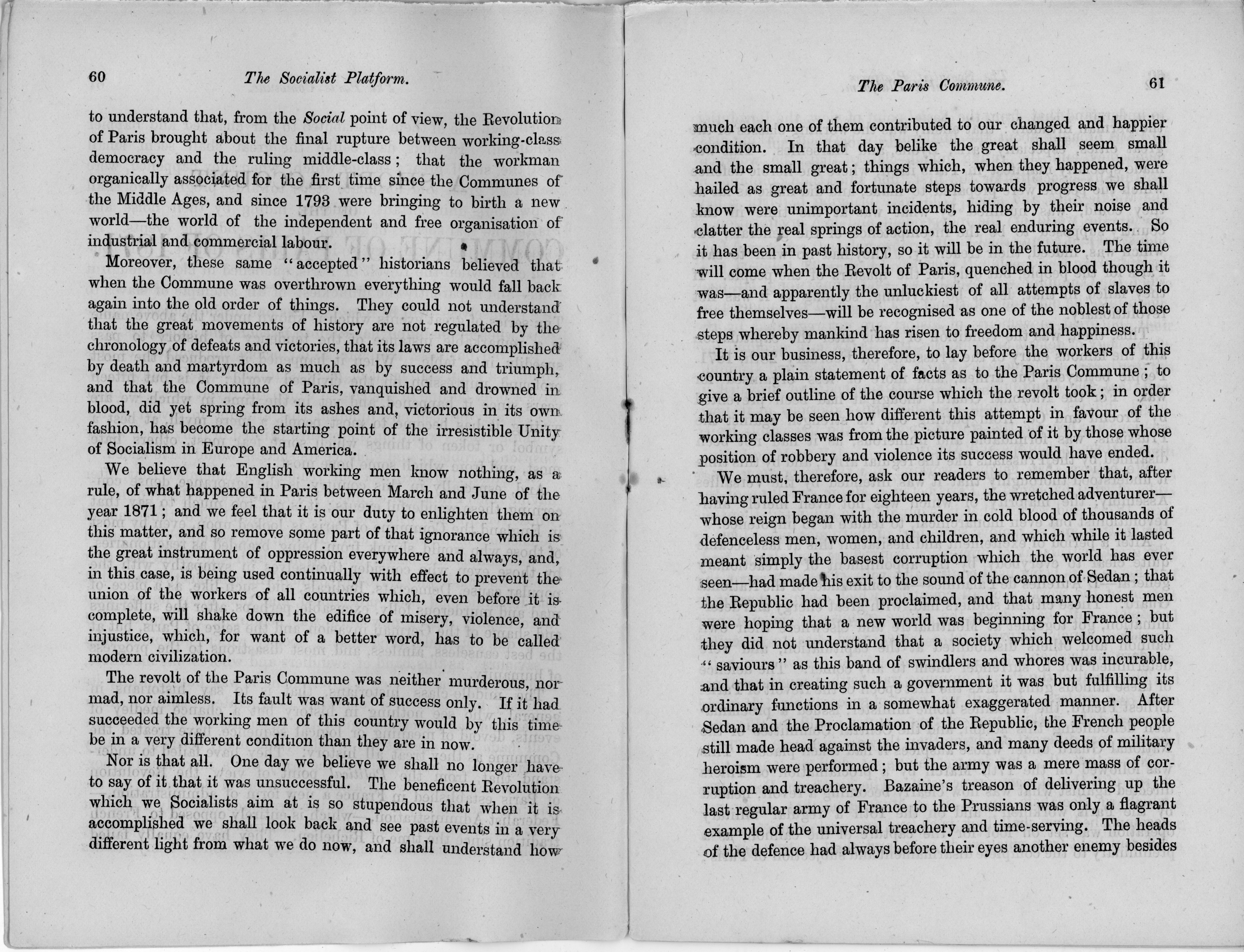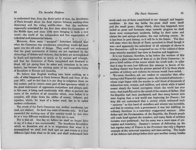 The revolt of the Paris Commune was neither murderous, not mad, nor aimless. Its fault was want of success only. If it had succeeded the working men of this country would by this time be in a very different condition than they are in now.