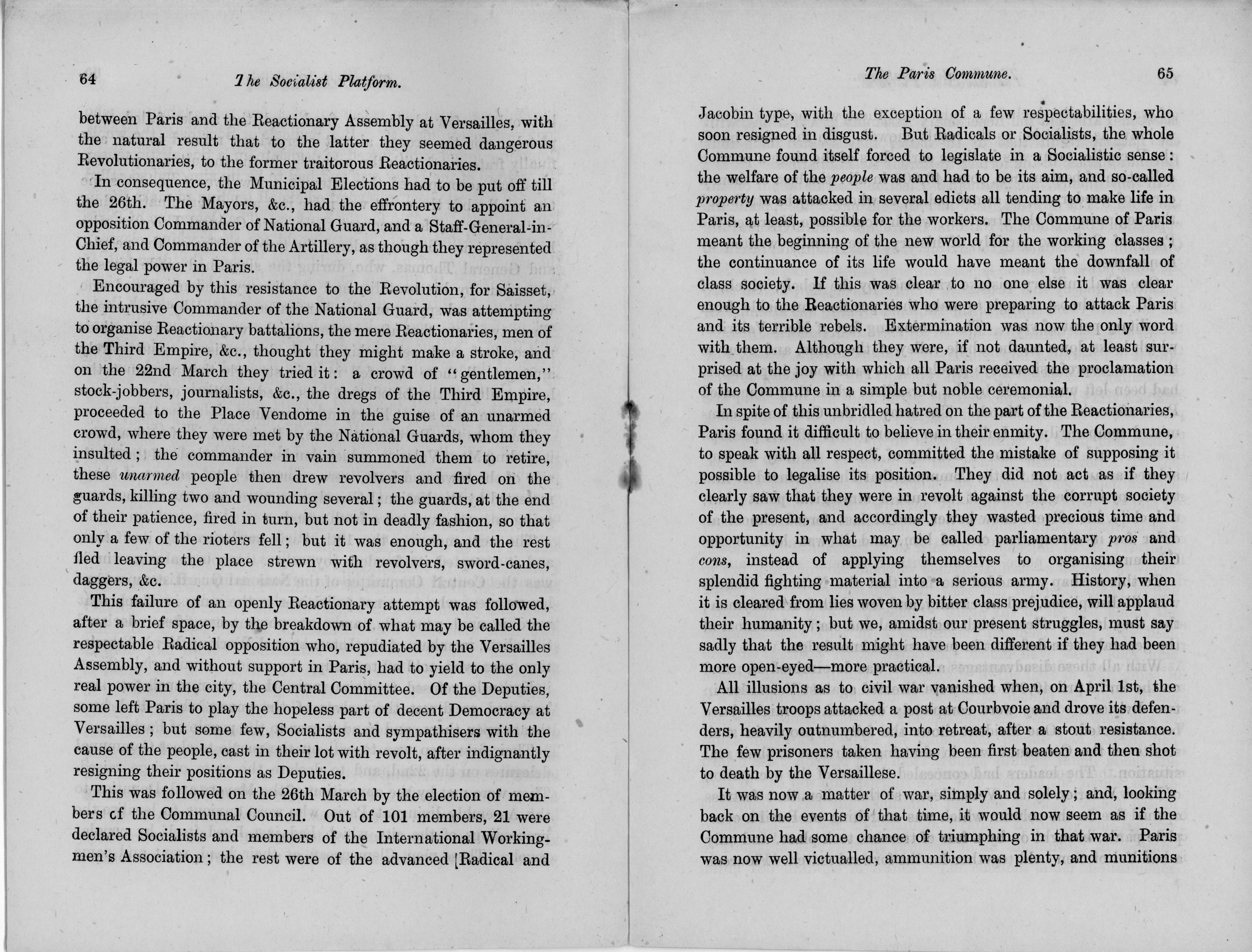 This failure of an openly Reactionary attempt was followed, after a brief space, by the breakdown of what may be called the respectable Radical opposition who, repudiated by the Versailles Assembly, and without support in Paris, had to yield to the only real power in the city, the Central Committee. Of the Deputies, some left Paris to play the hopeless part of decent Democracy at Versailles; but some few, Socialists and sympathizers with the cause of the people, cast in their lot with the revolt, after indignantly resigning their positions as Deputies.