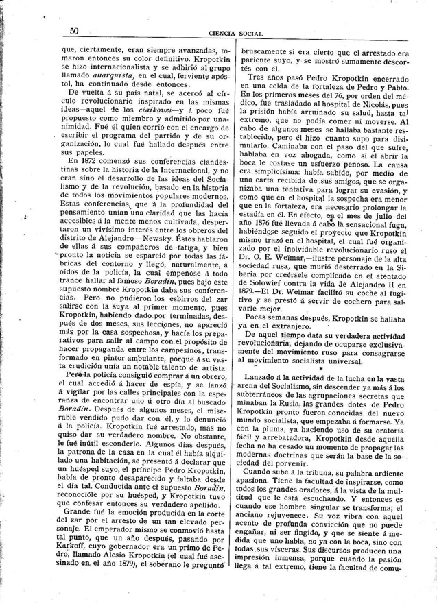 Lanzado á la actividad de la lucha en la vasta arena del Socialismo, sin descender ya más á los subterráneos de la agrupaciones secretas que minaban la Rusia, las grandes dotes de Pero Kropotkin pronto fueron conocidas del nuevo mundo socialista, que empezaba á formarse. Ya con la pluma, ya haciendo uso de su oratoria fácil y arrebatadora, Kroporkin desde aquella fecha no ha cesado un momento de propagar las modernas doctrinas que serán la base de la sociedad del porvenir.