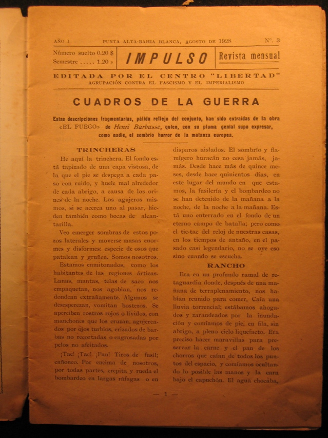 Estas descripciones fragmentarias, pálido reflejo del conjunto, han sido extraídas de la obra <EL FUEGO> de Henri Barbusse, quien, con su pluma genial supo expresar, como nadie, el sombrío horror de la matanza europea.