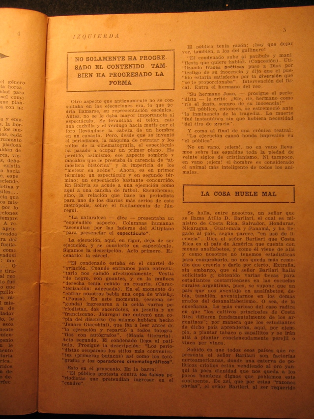 Another aspect of execution that previously wasn't considered was what could be called their representation as a stage. Before, not much importance was given to the spectacle. The curtain was raised, down came a knife and the executioner silently held the head in a basket for everyone to see. However, since the invention of journalism, this machine that takes photographs, and the rolling film of cinematography, the spectacle has come to occupy a prime position. At the same time, that somber and macabre aspect given by the shortage of "historic atmosphere" and the lack of skill of the "director of the film" has been lost. It's first of all a spectacle and second of all a well attended spectacle. In Bolivia they go to executions like we go to the football field. We listened, rather, to the story of the execution of Jauregui told by a journalist in one of this city's most serious newspapers.