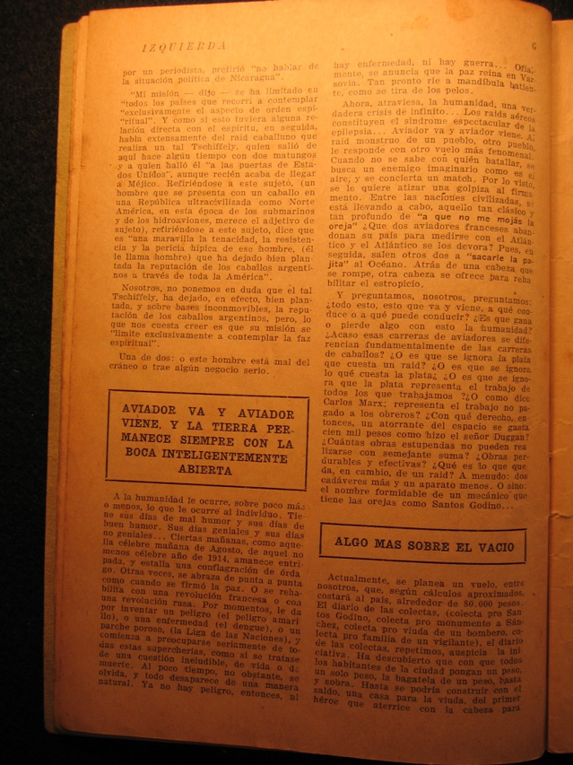 And we ask, us, we ask "all this, that comes and goes, what drives it or who can drive it? Is it that humanity wins or loses something with this? Maybe these pilot races fundamentally differ from the horse races? Or is it that they ignore the money a race costs? Or is it that they ignore what the money costs? Or is it that they ignore that the money represents the work done by all of us who work? Or like Karl Marx says; it represents the work not paid to the workers? With what right then does a waste of space cost one hundred thousand pesos, like the one Mr. Duggan made? How many stupendous works could be realized with a similar sum? Long lasting and effective works? What is it that a race, in contrast, leaves us with? Often: two more corpses and one less aircraft. Or rather: the fantastic name of a mechanic with ears like Santo Rodino...