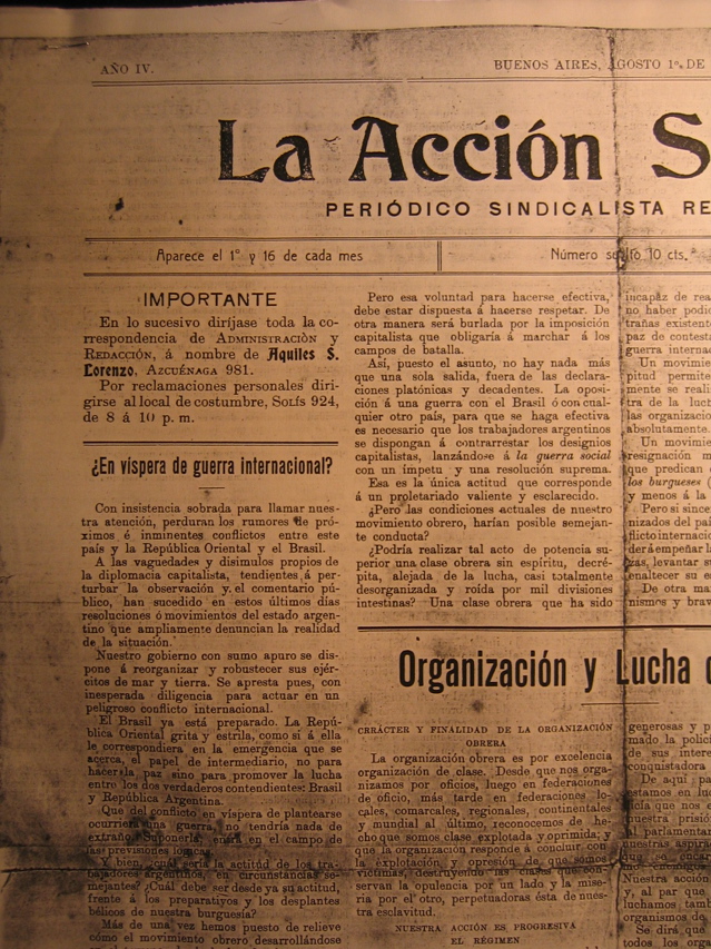 Entendemos que todo progreso se debe á la acción energica desarrollada por los individuos, pueblos y naciones oprimidas contra sus opresores. Nuestra acción es entonces progresiva, desde que la organización obrera va contra el patronato y el Estado con todos sus organismos é individuos que los conservan. Empieza ésta con el simple centavo exigido al burgués que nos explota, se desarrolla buscando siempre más amplios horizontes donde aplicar sus energias y se pierde en el infinito satisfaciendo las necesidades cada vez más crecientes de la vida.