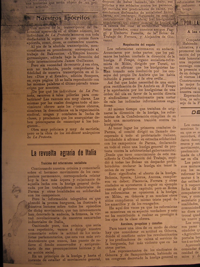 Al tener lugar los primeros combates de Parma, el comité dirigió un llamado desesperado á todo el proletariado italiano, incitándolo á afirmar su estrecha solidaridad con los campesinos de Parma, declarando en todo el reino una huelga general de protesta contra la arbitrariedad gubernamental. ¡Desde que tuvo conocimiento de este manifiesto la Confederación del Trabajo, expidió á todas las Bolsas un despacho prohibiéndoles declarar la huelga sin tener la orden de su parte.