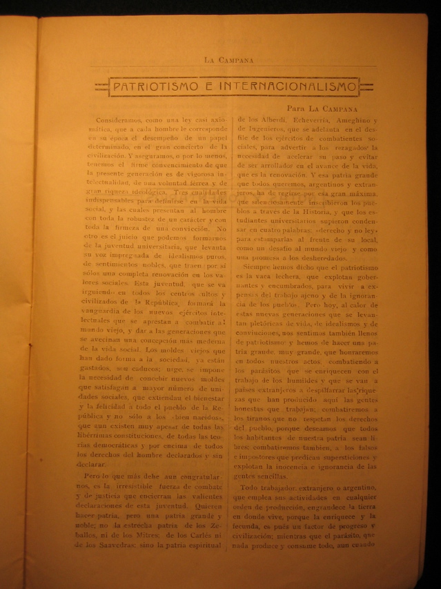 Siempre hemos dicho que el patriotismo es la vaca lechera, que explotaban gobernantes y encumbrados, para vivir a expensas del trabajo ajeno y de la ignorancia de los pueblos. Pero hoy, al calor de estas nuevas generaciones que se levantan pletoricas de vida, de idealismo y de conviuciones nos sentimos tambien llenos de patriotismo y hemos de hacer una patria grande muy grande que honraremos en todos nuestros actos, combatiendo a los parasitos que se enriquecen con el trabajo de los humildes y que se van a paises extranjeros a despilfarrar las riquezas que han producido aqui las gentes honestas que trabajan; combatiremos a los tiranos que no respetan los derechos del pueblo, porque deseamos que todos los habitantes de nuestra patria sean libres; combatiremos tambien a los falsos e impostores que predican supersticiones y explotan la inocencia e ignorancia de las gentes sencillas.