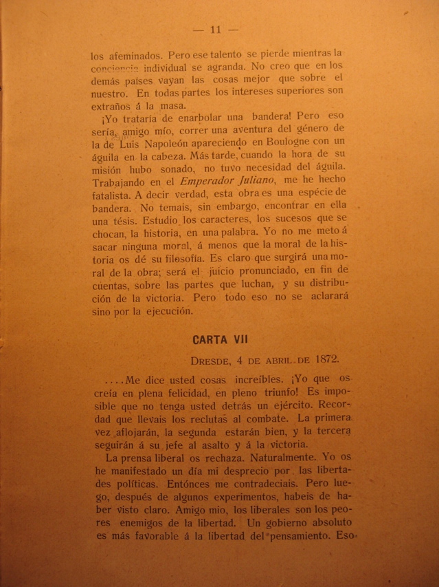 I would try to raise a flag! But that would be, my friend, doing an adventure of the type of Luis Napoleon appearing at Boulogne with an eagle on his head. Later on, when the time of his mission was up, he had no need for the eagle. Working on the "Julian Emperor," I have become a fatalist. To be honest, this work is a sort of flag. Don't be afraid, however, of finding in it a thesis. I study the characters, the events that collide, the history, in one word. I don't get involed to bring about any moral, unless the moral of history gives you it's philosophy. It's clear that a moral will come out of the work; it will be the pronounced judgement, in the end, about the parts that fight, and their distribution of victory. But everything will not be clarified but by the performance.