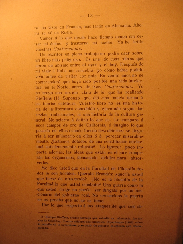 You tell me that in the School of Philosophy everyone shows hostility towards you. Dear Brandes: would you like it any other way? Aren't you fighting against scholar philosophy? A war like the one you are leading cannot be lead by a civil servant of the actual government. Not slamming their door at you would only prove that they are not afraid.