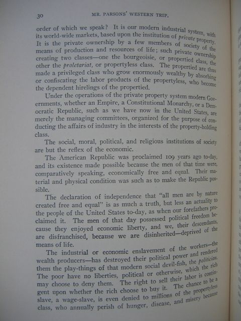 order of which we speak? It is our modern industrial system, with its world-wide markets, based upon the institution of private property. It is the private ownership by a few members of society of the means of production and resources of life; such private ownership creating two classes—one the bourgeoisie, or propertied class, the other the proletariat, or propertyless class. The propertied are thus made a privileged class who grow enormously wealthy by absorbing or confiscating the labor products of the propertyless, who become the dependent hirelings of the propertied.
