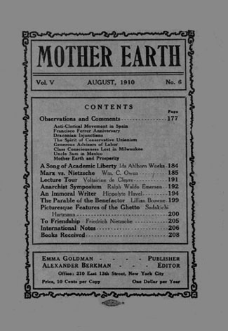 For more the benefit of all concerned, we will state that, considering the expenses of a magazine, the surplus of five hundred dollars is barely sufficient to tide Mother Earth over the few summer months. As to having the magazine on a safe material basis, or out of financial difficulties, - that is out of the question, at least until the social revolution arrives. We therefore very gently call the attention of our readers to the eternal struggle for existence of a magazine like Mother Earth.
